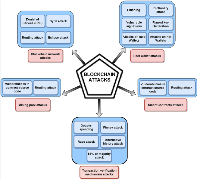- Cryptographic Attacks: Exploits weak keys or quantum computing threats to crack encryption, though current blockchains use quantum-resistant algorithms in some cases. (6)
